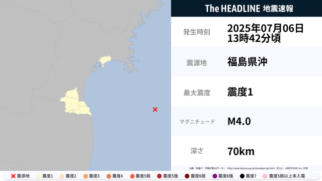 07月06日13時42分頃、福島県沖を震源とするマグニチュード4.0の地震が観測された。最大震度1を観測したのは、宮城県・福島県。