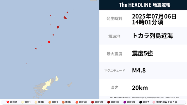 07月06日14時01分頃、トカラ列島近海を震源とするマグニチュード4.8の地震が観測された。最大震度5強を観測したのは、鹿児島県。