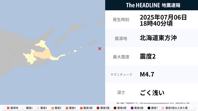 07月06日18時40分頃、北海道東方沖を震源とするマグニチュード4.7の地震が観測された。最大震度2を観測したのは、北海道。