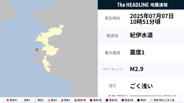07月07日10時51分頃、紀伊水道を震源とするマグニチュード2.9の地震が観測された。最大震度1を観測したのは、和歌山県。