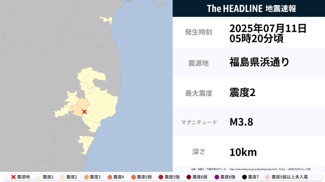 7月11日5時20分頃、福島県浜通りを震源とするマグニチュード3.8の地震が観測された。最大震度2を観測したのは、福島県。