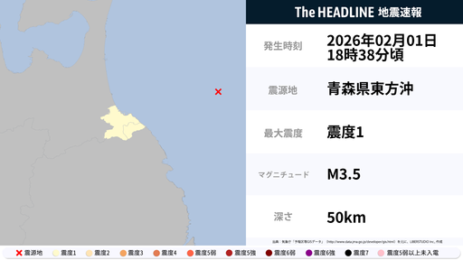 7月12日10時7分頃、青森県東方沖を震源とするマグニチュード3.7の地震が観測された。最大震度1を観測したのは、青森県。