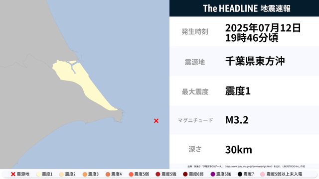 07月12日19時46分頃、千葉県東方沖を震源とするマグニチュード3.2の地震が観測された。最大震度1を観測したのは、茨城県。
