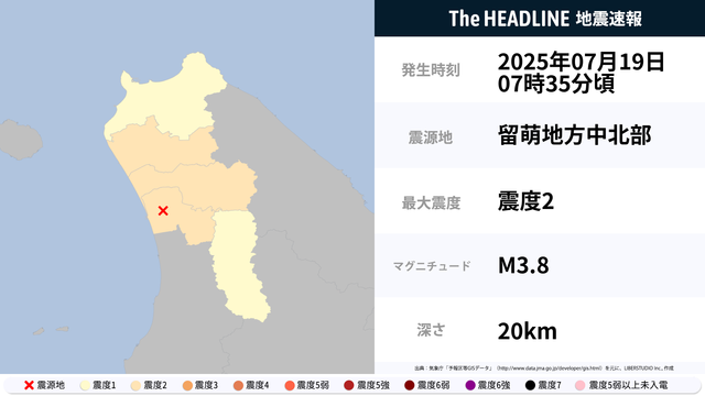 7月19日7時35分頃、北海道で最大震度2の地震を観測