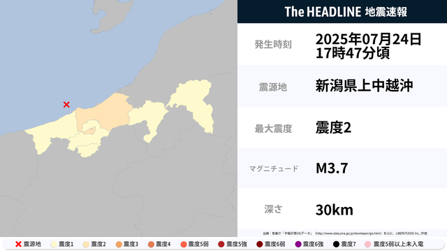 7月24日17時47分頃、新潟県上中越沖を震源とするマグニチュード3.7の地震が観測された。最大震度2を観測したのは、新潟県。