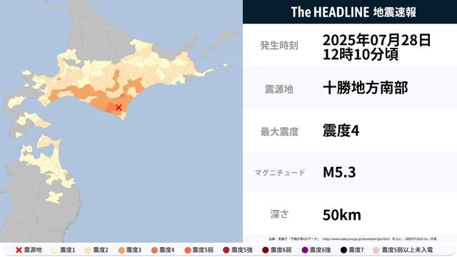 7月28日12時10分頃、十勝地方南部を震源とするマグニチュード5.3の地震が観測された。最大震度4を観測したのは、北海道。