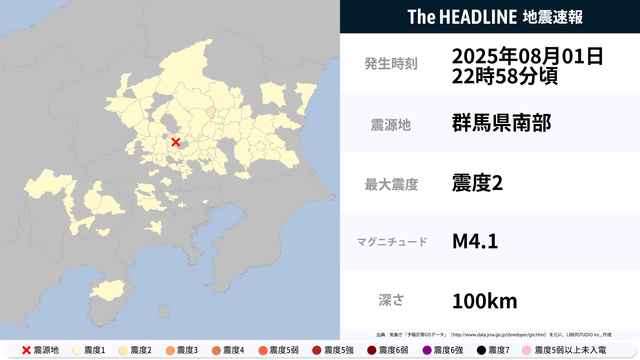 8月1日22時58分頃、群馬県南部を震源とするマグニチュード4.1の地震が観測された。最大震度2を観測したのは、栃木県・群馬県。