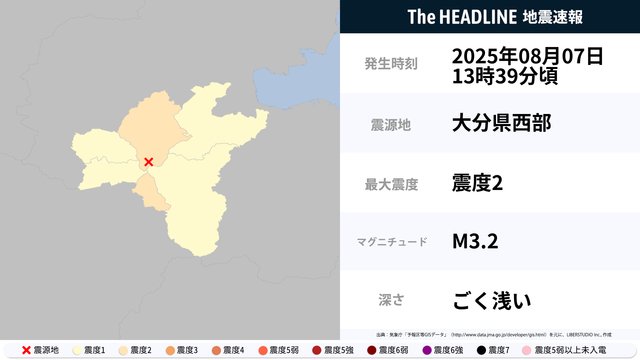 08月07日13時39分頃、大分県西部を震源とするマグニチュード3.2の地震が観測された。最大震度2を観測したのは、熊本県・大分県。