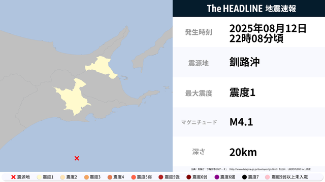 8月12日22時8分頃、釧路沖を震源とするマグニチュード4.1の地震が観測された。最大震度1を観測したのは、北海道。