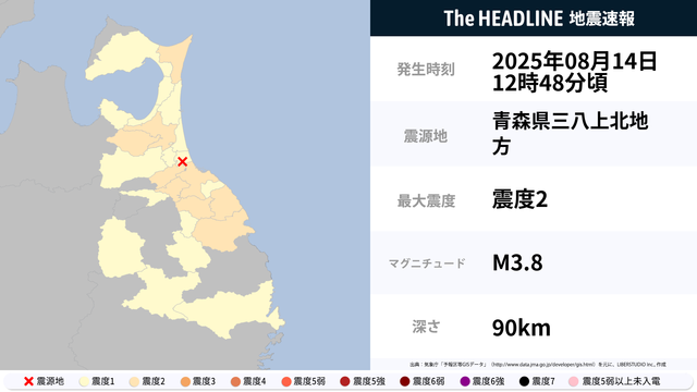 8月14日12時49分頃、青森県・岩手県で最大震度2の地震を観測