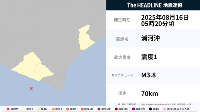 8月16日5時20分頃、浦河沖を震源とするマグニチュード3.8の地震が観測された。最大震度1を観測したのは、北海道。
