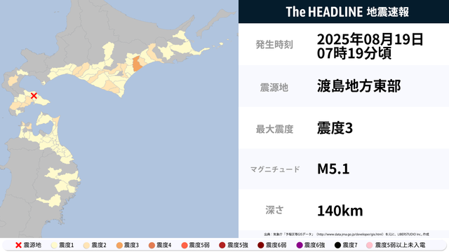 8月19日7時19分頃、渡島地方東部を震源とするマグニチュード5.1の地震が観測された。最大震度3を観測したのは、北海道。