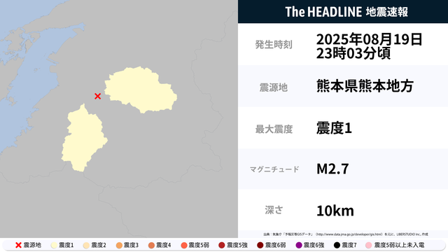 8月19日23時3分頃、熊本県熊本地方を震源とするマグニチュード2.7の地震が観測された。最大震度1を観測したのは、熊本県。