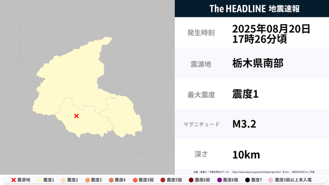 8月20日17時26分頃、栃木県南部を震源とするマグニチュード3.2の地震が観測された。最大震度1を観測したのは、栃木県。