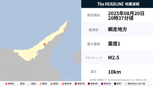 8月20日20時37分頃、網走地方を震源とするマグニチュード2.5の地震が観測された。最大震度1を観測したのは、北海道。