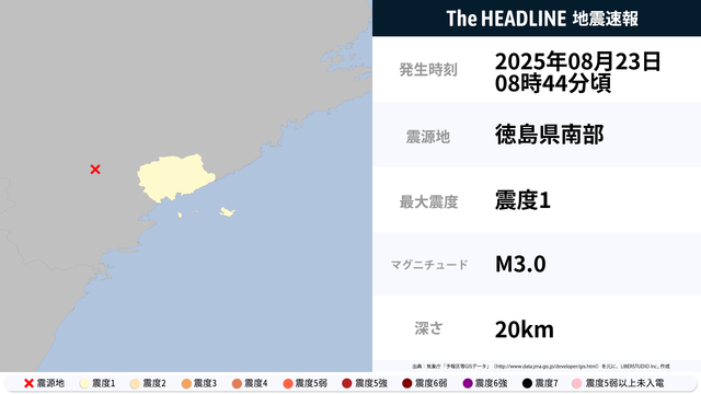 8月23日8時44分頃、徳島県で最大震度1の地震を観測
