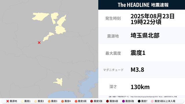8月23日19時22分頃、埼玉県北部を震源とするマグニチュード3.8の地震が観測された。最大震度1を観測したのは、群馬県・埼玉県など。