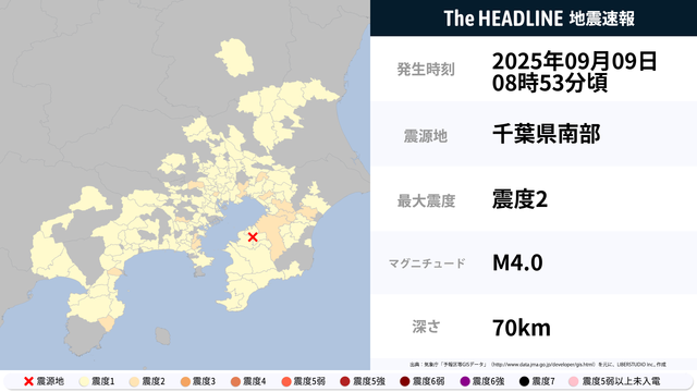 9月9日8時53分頃、千葉県南部を震源とするマグニチュード4.0の地震が観測された。最大震度2を観測したのは、千葉県・東京都など。