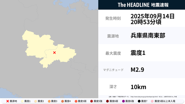 9月14日20時53分頃、兵庫県南東部を震源とするマグニチュード2.9の地震が観測された。最大震度1を観測したのは、兵庫県。