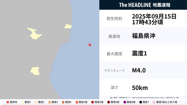 9月15日17時43分頃、福島県沖を震源とするマグニチュード4.0の地震が観測された。最大震度1を観測したのは、福島県・茨城県。