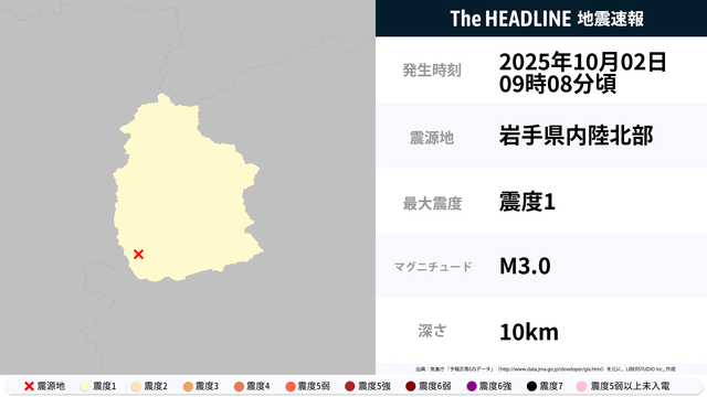 10月2日9時8分頃、岩手県内陸北部を震源とするマグニチュード3.0の地震が観測された。最大震度1を観測したのは、岩手県。