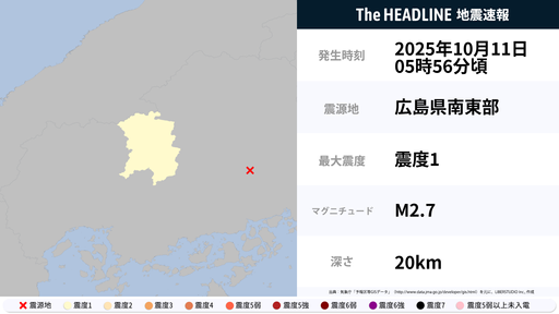 10月2日20時41分頃、広島県・山口県などで最大震度1の地震を観測