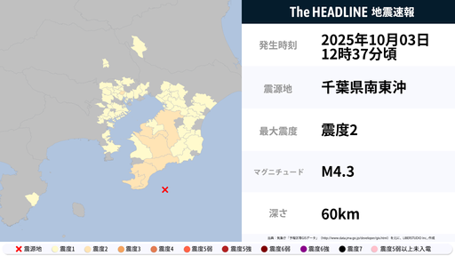 10月3日12時48分頃、千葉県・東京都で最大震度2の地震を観測