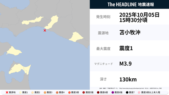 10月5日15時30分頃、苫小牧沖を震源とするマグニチュード3.9の地震が観測された。最大震度1を観測したのは、北海道・青森県。