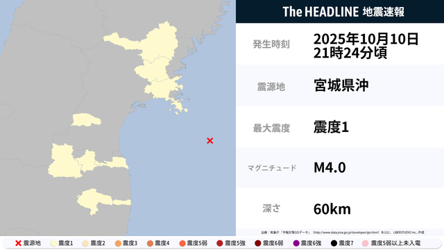10月10日21時24分頃、宮城県沖を震源とするマグニチュード4.0の地震が観測された。最大震度1を観測したのは、岩手県・宮城県など。