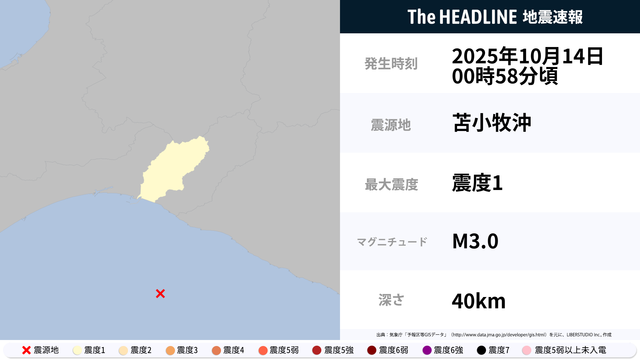 10月14日0時58分頃、苫小牧沖を震源とするマグニチュード3.0の地震が観測された。最大震度1を観測したのは、北海道。
