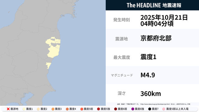 10月21日4時4分頃、京都府北部を震源とするマグニチュード4.9の地震が観測された。最大震度1を観測したのは、福島県・茨城県。