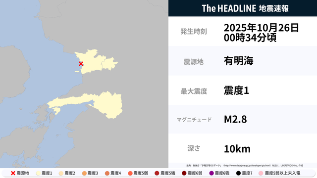 10月26日0時34分頃、有明海を震源とするマグニチュード2.8の地震が観測された。最大震度1を観測したのは、熊本県。