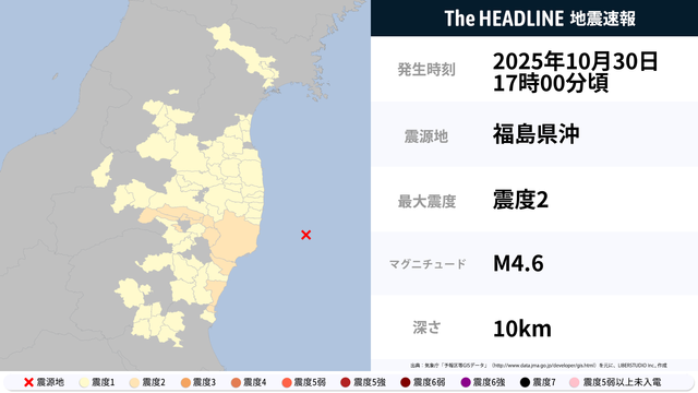 10月30日17時0分頃、福島県沖を震源とするマグニチュード4.6の地震が観測された。最大震度2を観測したのは、福島県・茨城県。