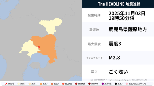 11月3日19時51分頃、鹿児島県で最大震度3の地震を観測