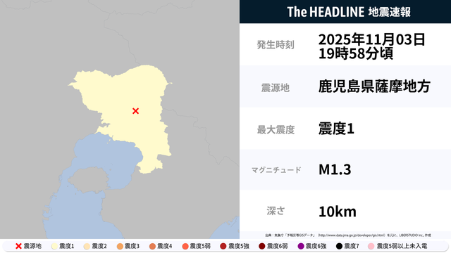 11月03日19時58分頃、鹿児島県薩摩地方を震源とするマグニチュード1.3の地震が観測された。最大震度1を観測したのは、鹿児島県。
