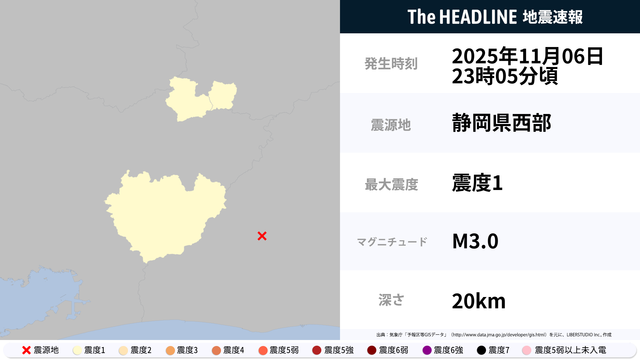 11月6日23時5分頃、静岡県西部を震源とするマグニチュード3.0の地震が観測された。最大震度1を観測したのは、長野県・静岡県など。
