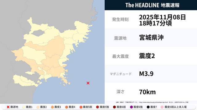 11月8日18時17分頃、宮城県沖を震源とするマグニチュード3.9の地震が観測された。最大震度2を観測したのは、岩手県・宮城県。