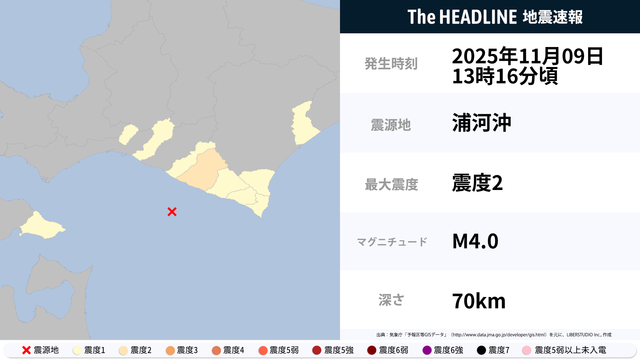 11月9日13時16分頃、浦河沖を震源とするマグニチュード4.0の地震が観測された。最大震度2を観測したのは、北海道。
