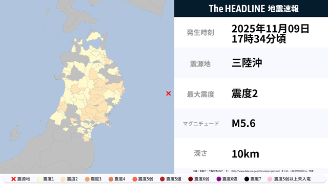 11月09日17時34分頃、三陸沖を震源とするマグニチュード5.6の地震が観測された。最大震度2を観測したのは、青森県・岩手県など。