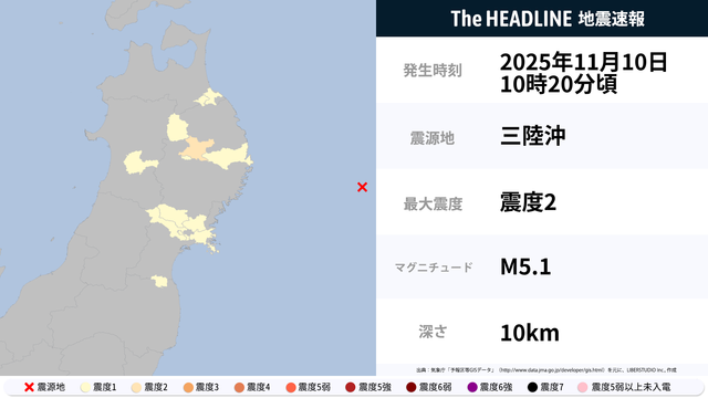 11月10日10時20分頃、三陸沖を震源とするマグニチュード5.1の地震が観測された。最大震度2を観測したのは、岩手県。