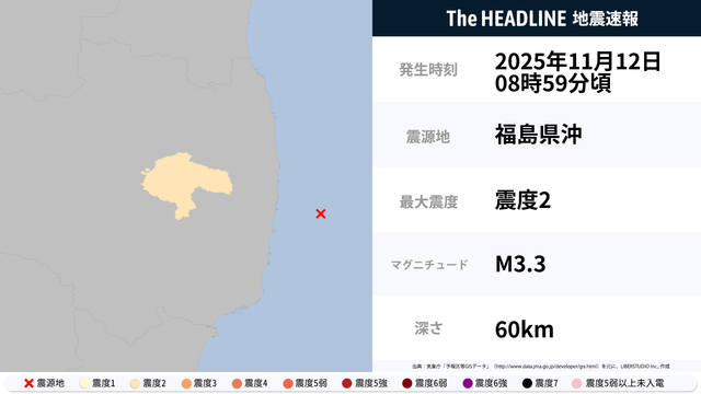 11月12日8時59分頃、福島県沖を震源とするマグニチュード3.3の地震が観測された。最大震度2を観測したのは、福島県。