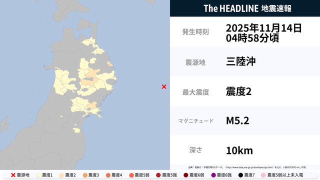 11月14日4時58分頃、三陸沖を震源とするマグニチュード5.2の地震が観測された。最大震度2を観測したのは、岩手県・宮城県。