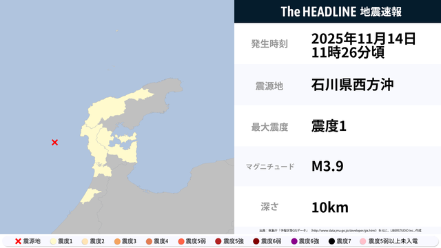 11月14日11時26分頃、石川県西方沖を震源とするマグニチュード3.9の地震が観測された。最大震度1を観測したのは、石川県。