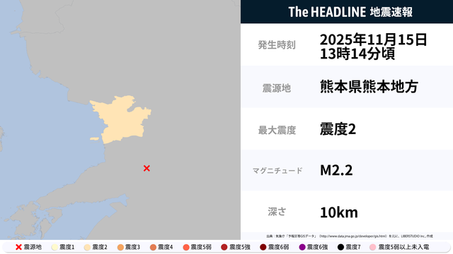11月15日13時14分頃、熊本県熊本地方を震源とするマグニチュード2.2の地震が観測された。最大震度2を観測したのは、熊本県。