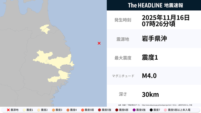 11月16日7時26分頃、岩手県沖を震源とするマグニチュード4.0の地震が観測された。最大震度1を観測したのは、青森県・岩手県。