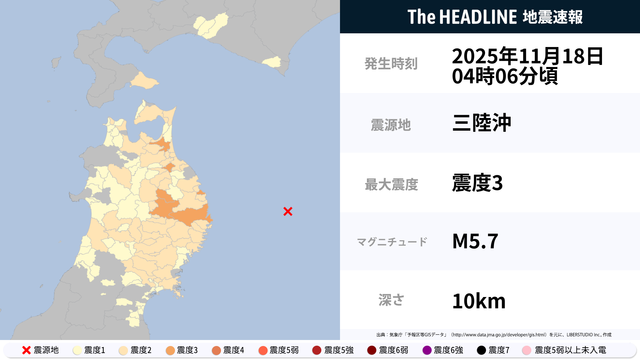 11月18日4時6分頃、三陸沖を震源とするマグニチュード5.7の地震が観測された。最大震度3を観測したのは、青森県・岩手県。