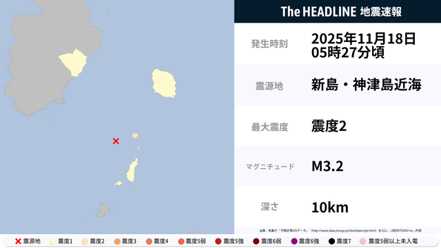 11月18日05時27分頃、新島・神津島近海を震源とするマグニチュード3.2の地震が観測された。最大震度2を観測したのは、東京都。