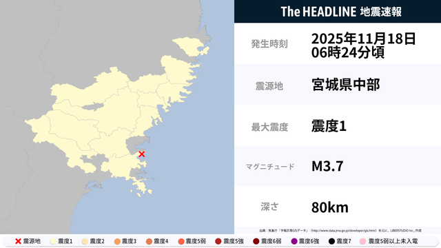 11月18日6時24分頃、宮城県中部を震源とするマグニチュード3.7の地震が観測された。最大震度1を観測したのは、岩手県・宮城県。