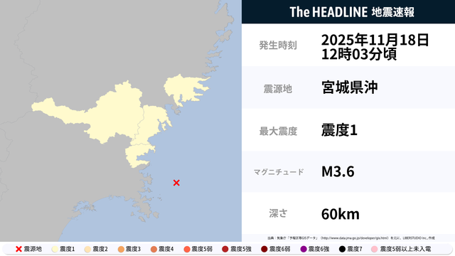 11月18日12時03分頃、宮城県沖を震源とするマグニチュード3.6の地震が観測された。最大震度1を観測したのは、岩手県・宮城県。