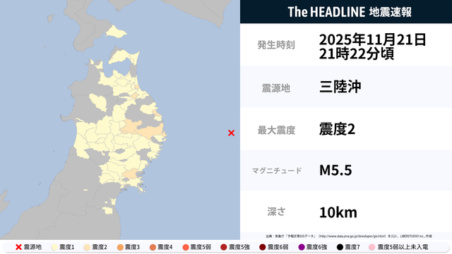 11月21日21時22分頃、三陸沖を震源とするマグニチュード5.5の地震が観測された。最大震度2を観測したのは、青森県・岩手県など。